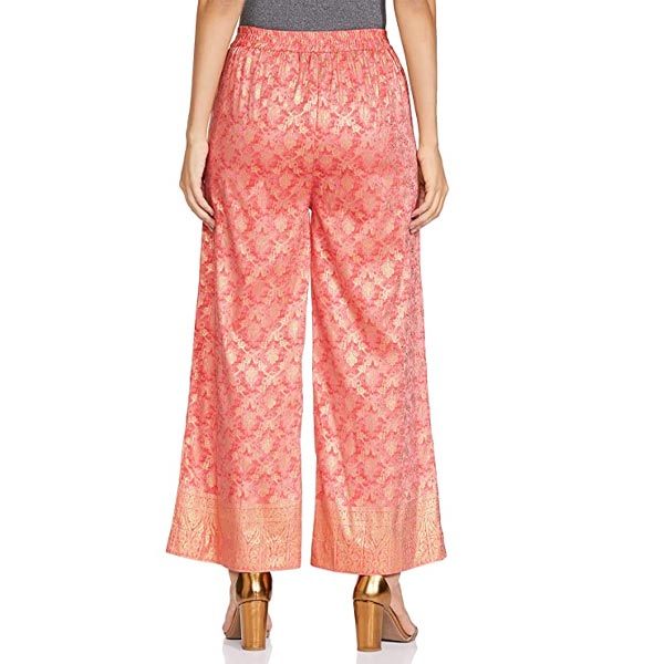 • Pink coloured straight palazzos with ornamental foil print detail and elasticated waistband.