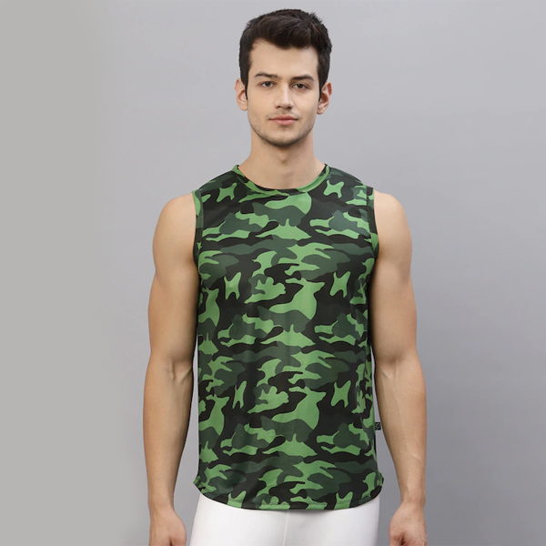 Green and black printed slim fit gym vest, has a round neck and sleeveless